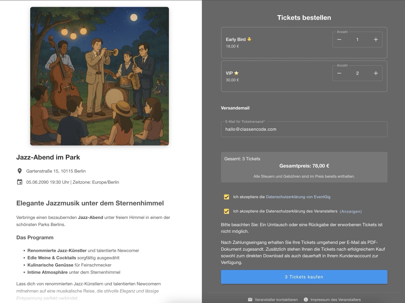 EventGig.de ist eine in Deutschland entwickelte und gehostete Plattform für Event-Ticketing. Wir verstehen die besonderen Anforderungen des deutschen Marktes und bieten eine vollständig DSGVO-konforme Lösung.