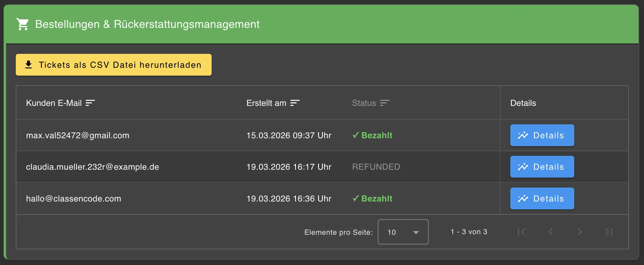 Auf der Veranstaltungsdetailseite findest Du eine vollständige Übersicht aller Bestellungen. So behältst Du jederzeit den Überblick über Deine Verkäufe und kannst bei Bedarf schnell reagieren.