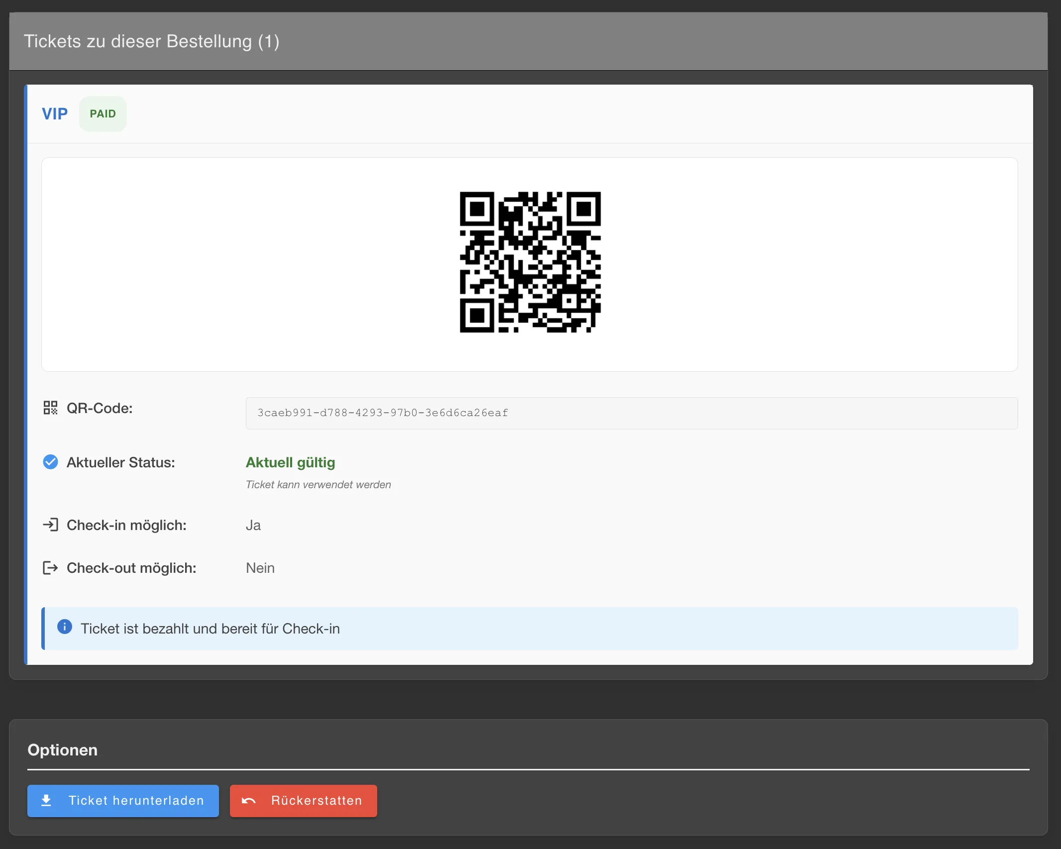 Über den "Details" Button in der Tabelle gelangst Du zur Detailansicht einer Bestellung. Dort siehst Du alle Tickets dieser Bestellung mit QR-Code, aktuellem Status und Check-in Informationen. Von hier aus kannst Du einzelne Tickets herunterladen oder eine Rückerstattung auslösen.